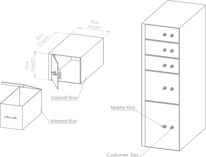 هي صناديق تستخدم لحفظ المقتنيات الثمينة في البنوك و تعمل بنظام المفتاح المزدوج حيث يمتلك العميل مفتاحا و يكون الماستر لدى البنك و لا يمكن فتح الصندوق الا بالمفتاحين معا و في ان واحد.
