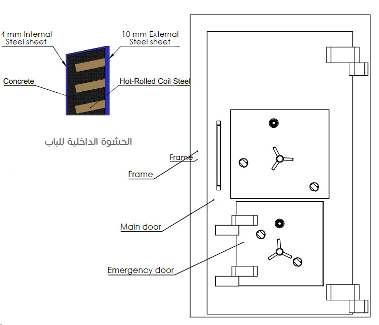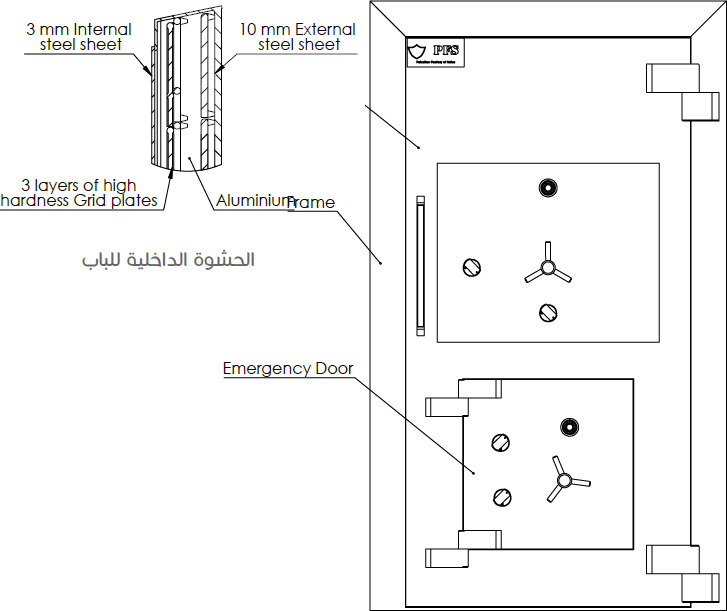 وينتج المصنع الأبواب المحصنة بعدة مقاييس تختلف باختلاف أماكن تواجدها لدى الزبون، هذا و من الجدير بالذكر ان المصنع حائز على شهادة ) VdS ( الألمانية التي حصل عليها مؤخرا للابواب المحصنة ) ST ( عام 2017 و هي أبواب ذات تحصين عالي جدا حشوتها من حديد السكب و الالمنيوم المذاب.